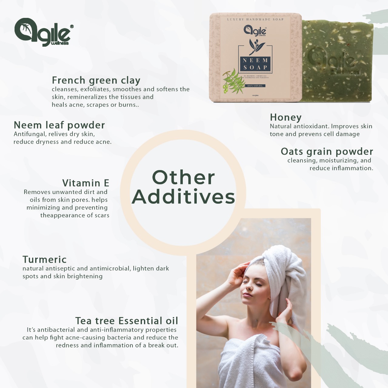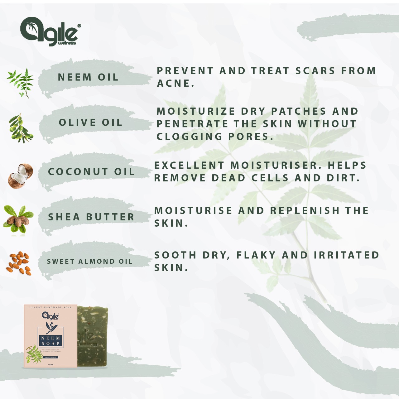Purely hand-crafted, traditionally made Neem Soap with all natural ingredients and cured for 45 days. Made with Neem, Turmeric, and Tea Tree essential oil. I am rich in anti-bacterial, anti-fungal, anti-inflammatory, and antiseptic properties. I am suitable for skin disorders and acne-prone skin. Glycerine is a natural by-product of the soap-making process and hence gives a good moisturising effect (Weight: 120 g).
